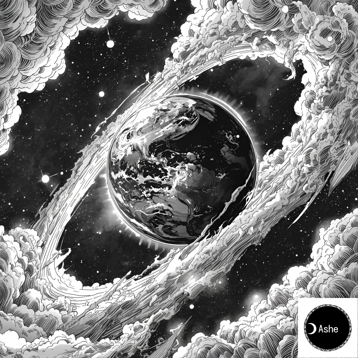 CanvaのAIで制作した、雲とリングに囲まれた地球を描く壮大なモノクロデザインがSUZURIに登場!Tシャツ、パーカー、マグカップなど、クールなオリジナルグッズをチェック。