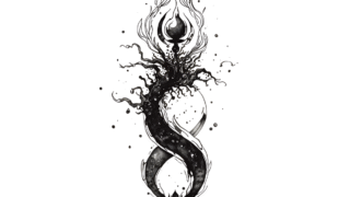 CanvaのAIで制作した、炎と無限(インフィニティ)を組み合わせたクールなモノクロデザインがSUZURIに登場!Tシャツやマグカップなど、オリジナルグッズで日常を彩ります。