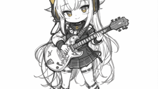 AIで制作した、ギターとヘッドホン姿のロックミニキャラがSUZURIに登場!モノクロの繊細なスケッチ風デザインは、音楽好きの心をくすぐるクールな一枚。Tシャツやモバイルバッテリーに最適です。