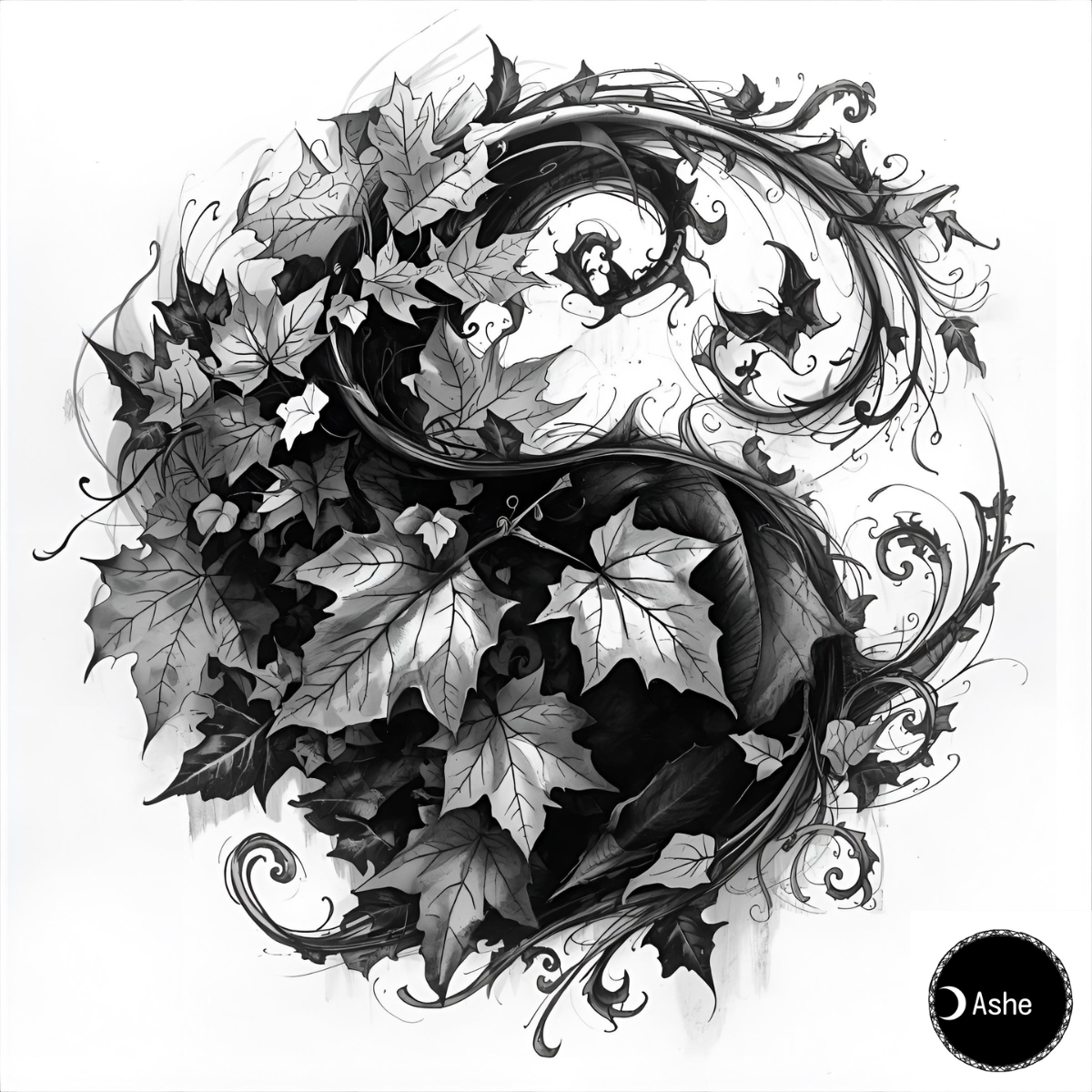 和風とタトゥーアートの要素を融合させた、この美しい紅葉のモノクロアートは、秋の季節感を持ちつつ、AIが作り出す繊細でアート性の高い表現が特徴です。特に、舞い散る紅葉の葉一枚一枚のディテールと、背景の渦巻くような模様にこだわりました。