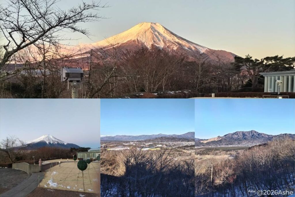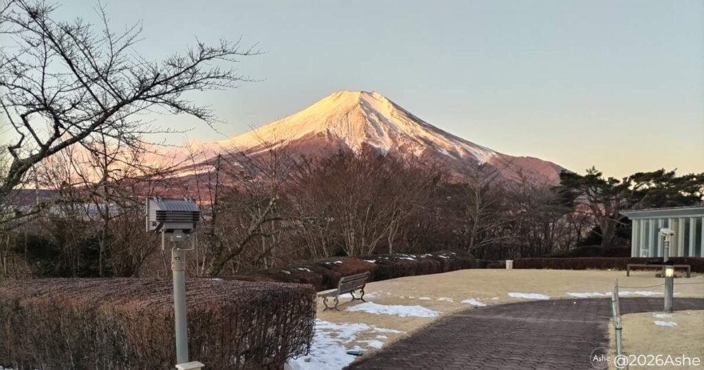 そこで待っていたのは、朝日を浴びてほんのりと色づく富士山の姿です。 1日目の「ダイヤモンド富士」のような神々しさとはまた違い、どっしりと構えるその姿は、何度見ても心が洗われるような美しさでした。