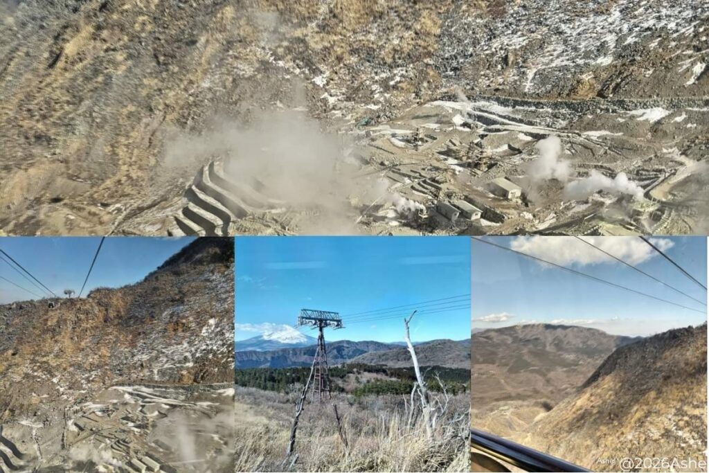 ロープウェイから見下ろす景色は、まさに「絶景」の一言。 あちこちから吹き出す湯けむりと、硫黄の香り。先ほどの静かな富士山とは打って変わって、大地の力強いエネルギーを全身で感じる場所でした。